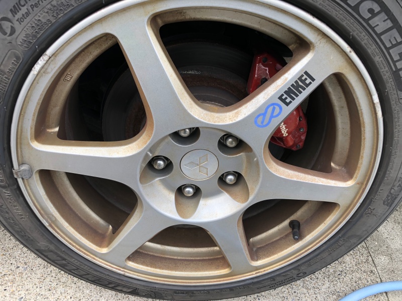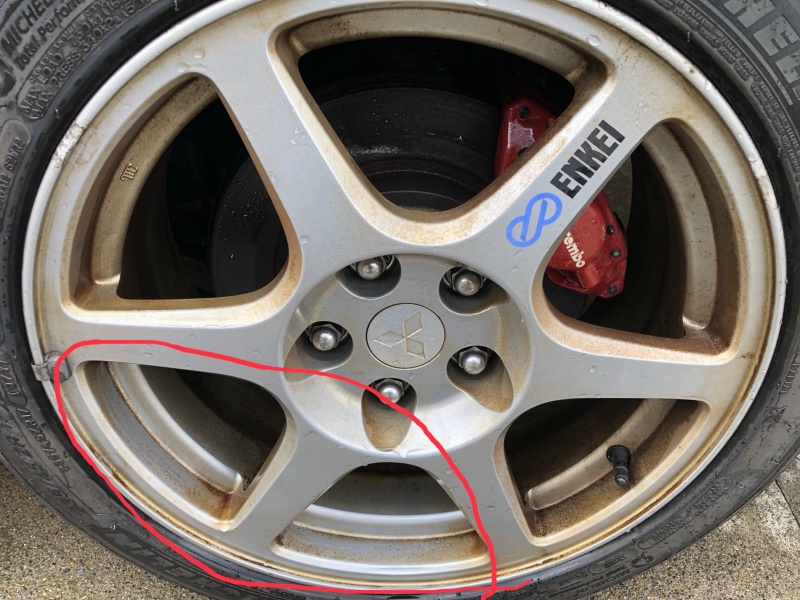 私の所有しているランエボ8MRの純正ホイールはENKEIの6本スピークで形状はいい感じなのですが、よく見ると非常に汚いです・・・。
