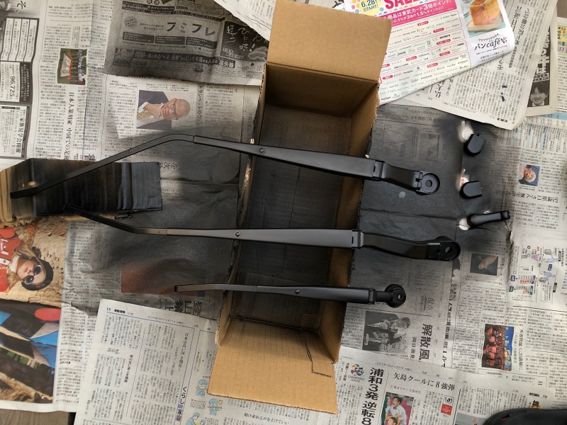 とりあえず適当に新聞紙を敷いて、そこにダンボールを置いて、その上にワイパーアームを置いて、スプレーして行きます。
