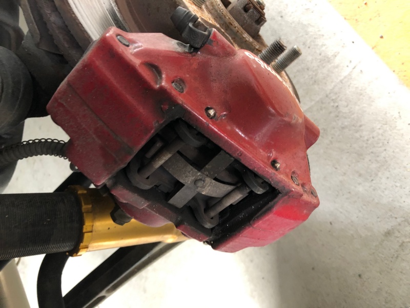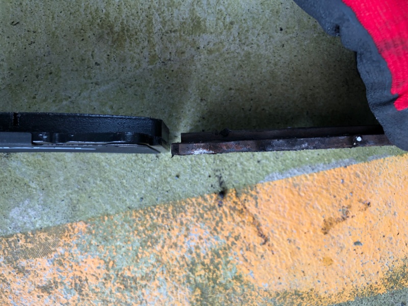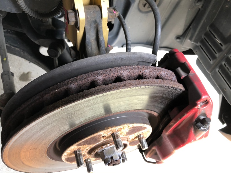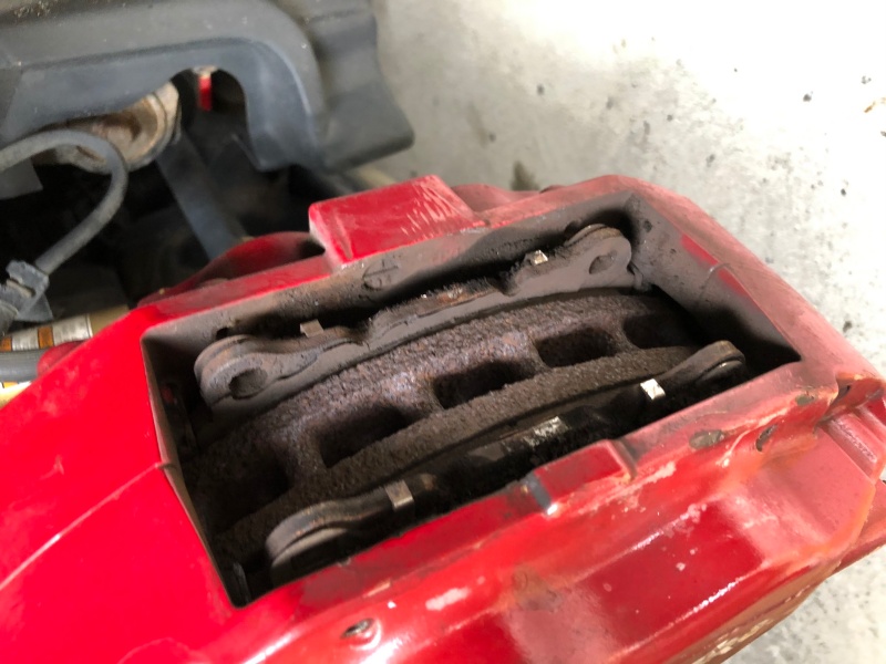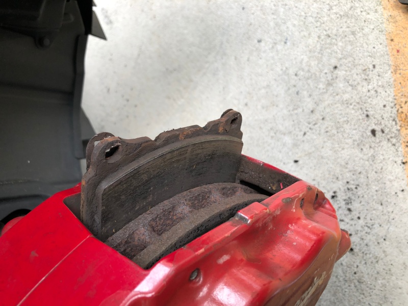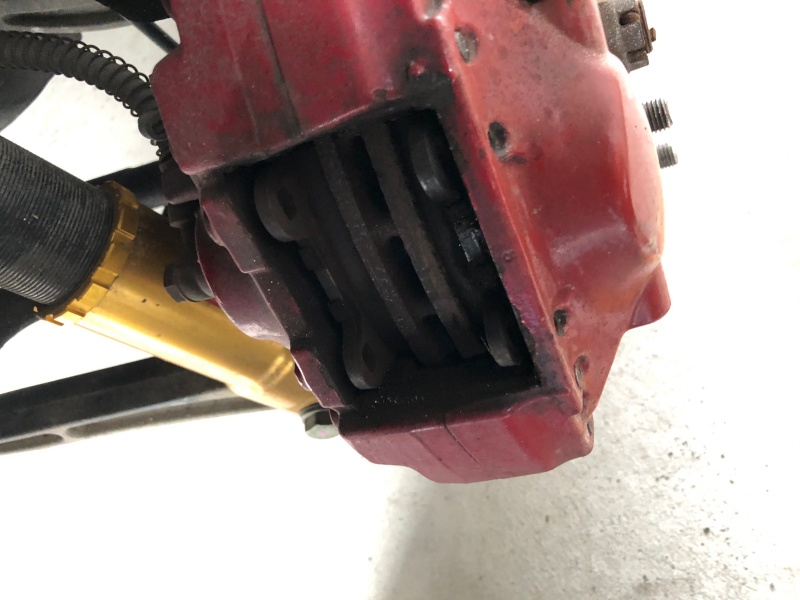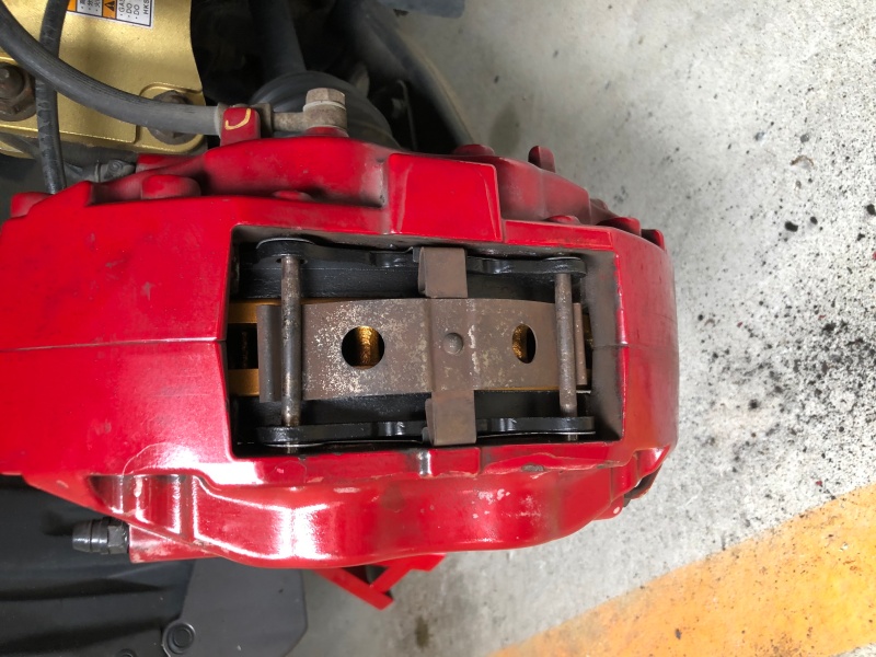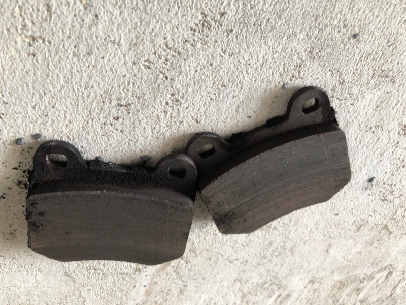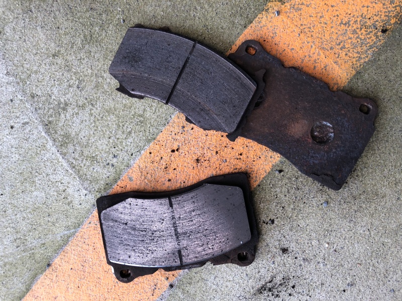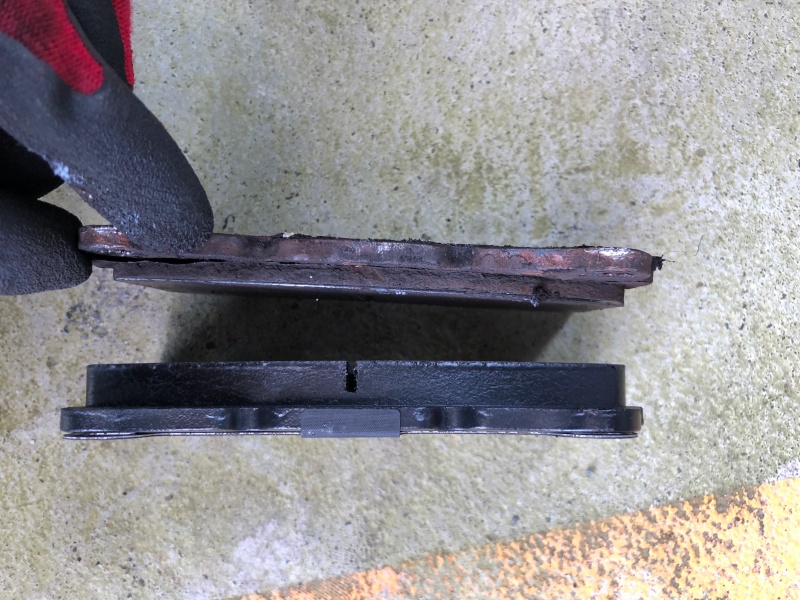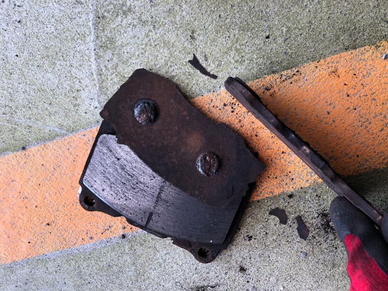 左側も同じ手順で作業していきますが、フロント左の外したブレーキパッドがかなりやばかったです。それがこちら。