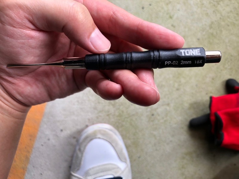 最初に今付いているブレーキパッドを引っこ抜きます。そのために必要な道具がこちらのピンポンチ。