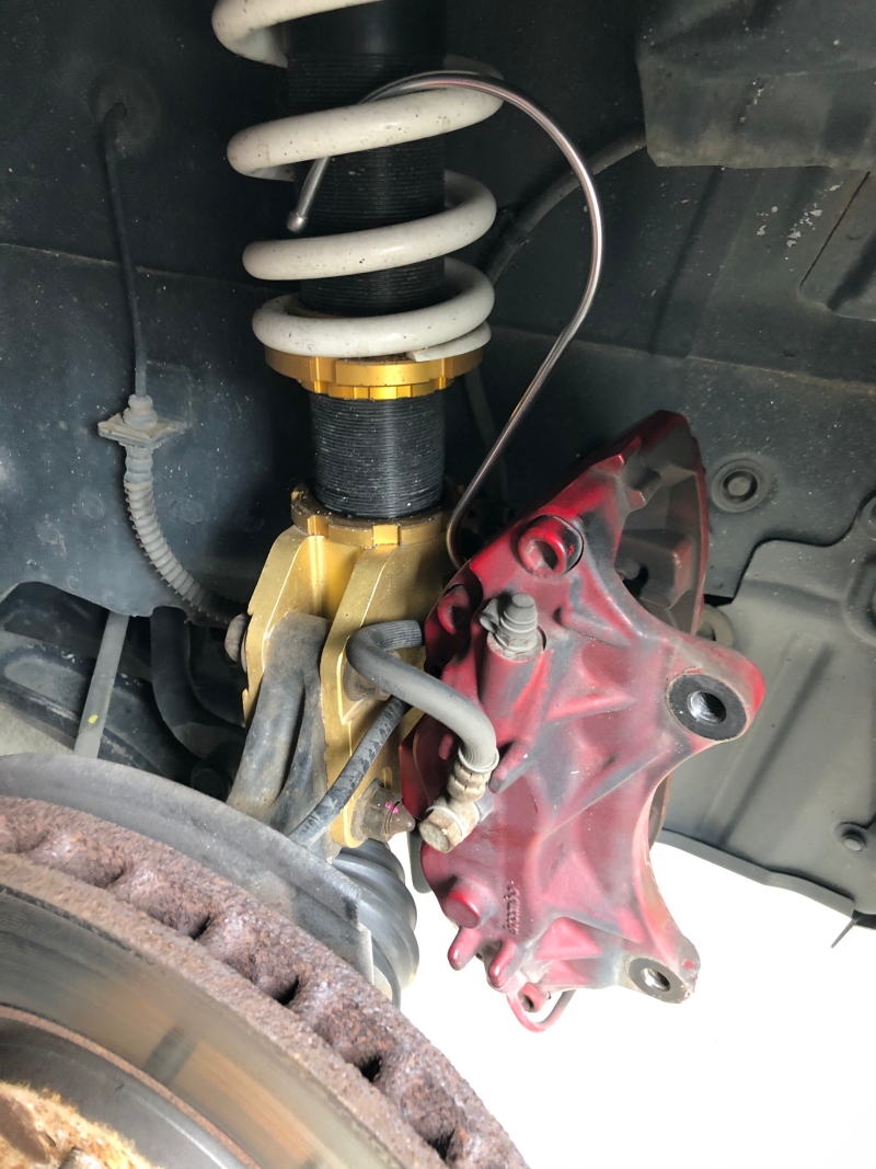 ボルトを外したキャリパーはS字フックで車高調のバネに吊るしておきます。S字フックは適当に百均で買ったもので十分です。