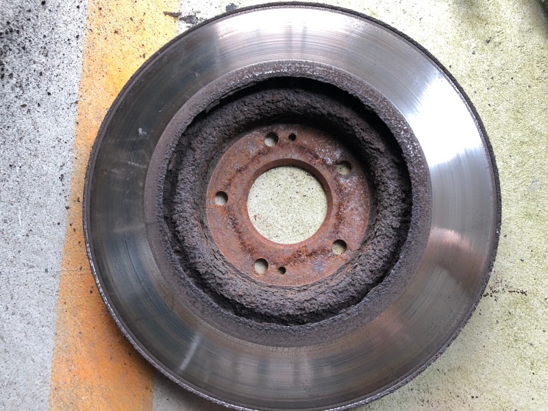 外れたローターがこちらです。見るからにボロボロです。錆びすぎ・・・。ローターとパッドは捨てます。