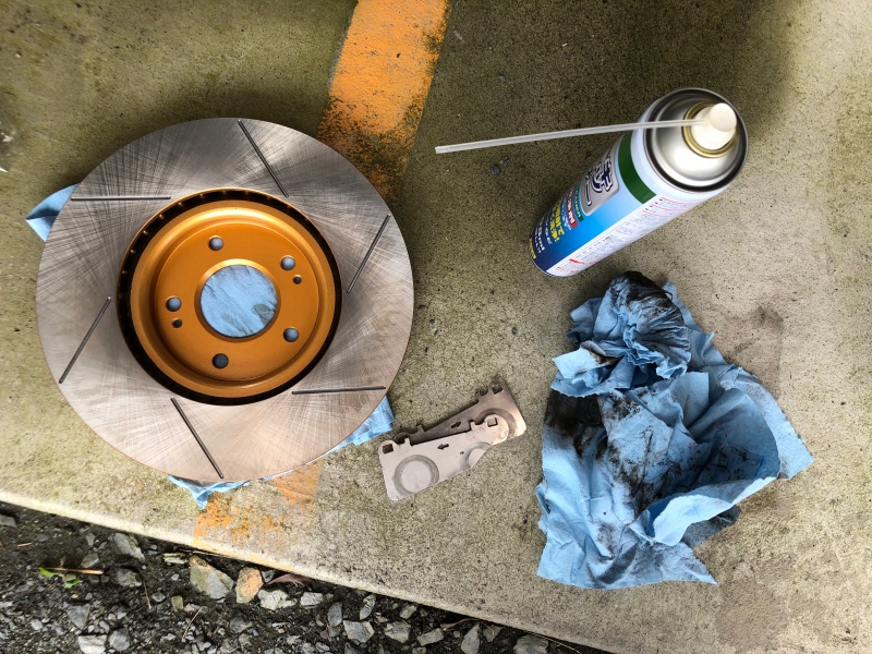それでは、新しいローターを取り付けますが、その前にまずは新品ローターが錆びないように表面に油が塗り込まれているみたいで、脂っこいのでパーツクリーナーで脱脂します。