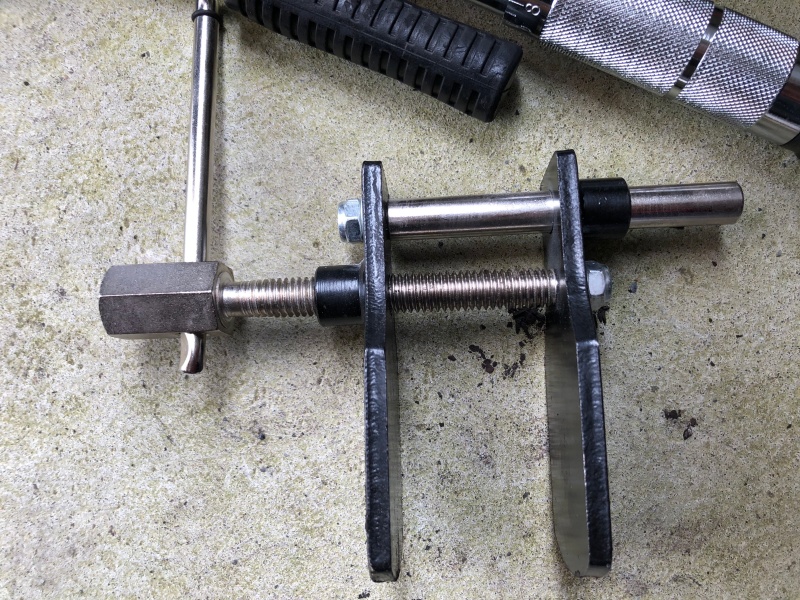 新しいブレーキパッドを入れる前に、ブレーキピストン戻しツールでピストンを押し戻します。対向でフロントは4podなので全て同時に押し戻してあげます。