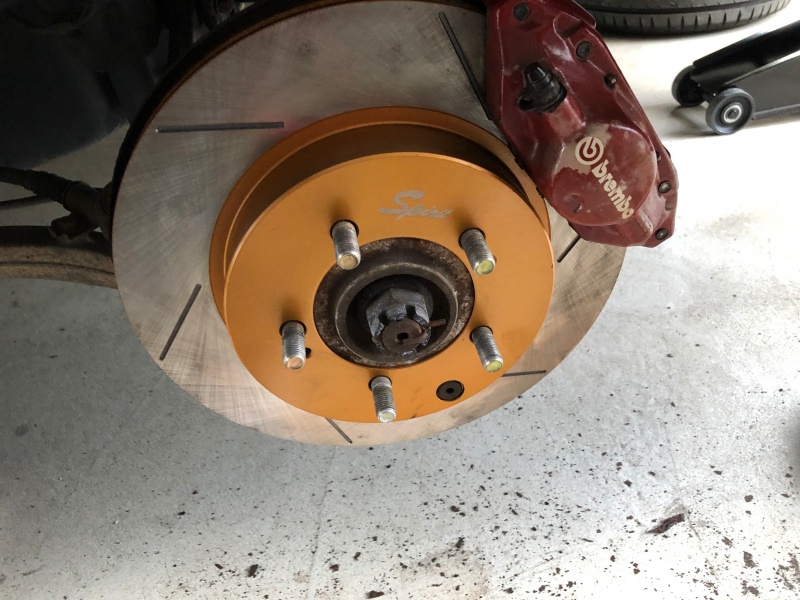 ある程度脱脂したらローターを取り付けます。ガタガタ動いてしまうので、ホイールナットで仮固定しておきます。
